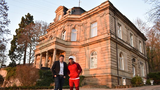 Rückblick ins Jahr 2019: Eventveranstalter Benedikt Feltens (links) mit Musiker Pietro Lombardi vor der Villa Kalles. Dieser drehte in der Villa ein Musikvideo. John Sauvourel