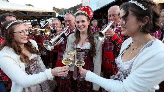 Nicht nur Rheinbrohler lockt das Weinfest an den Campus Limitis. Zum Einzug von Weinkönigin Lea waren der regionale Weinadel, musikalischer Besuch aus den Niederlanden und Ehrengäste aus Frankreich angereist.