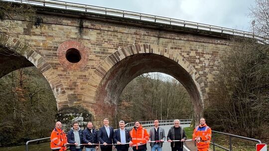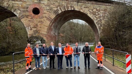 Bei einem Ortstermin überzeugten sich am Donnerstag Landrat Miroslaw Kowalski, der für den Straßenbau zuständige Dezernent Roland Praetorius, Karsten Becker, Leiter der Masterstraßenmeisterei (MSM) Kirn, sowie Klaus Franzmann und Sascha Welsch von der Straßenmeisterei Birkenfeld als Vertreter des Landesbetriebs Mobilität (LBM), die Ortsbürgermeister Jochen Bier (Kronweiler) und Frank Robbert (Sonnenberg-Winnenberg) sowie Lukas Reuter und Philipp Wild von der bauausführenden Firma Juchem (Niederwörresbach) vom gelungenen Abschluss der Maßnahme.