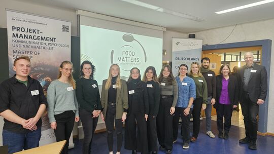 Das Organisationsteam und Vortragende der Infoveranstaltung zur Lebensmittelverschwendung des neuen Studiengangs Projektmanagement am Umwelt-Campus Birkenfeld der Hochschule Trier, vlnr: