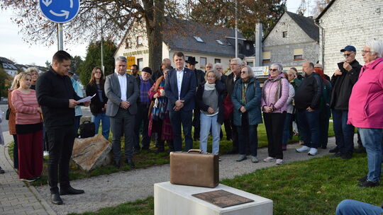 Zu einer Gedenkstunde für die Opfer der Deportation vom 16. Oktober 1941 hatten die Ortsgemeinde und der Arbeitskreis (AK) Stolpersteine an das neue Denkmal des „Verlorenen Koffers“ eingeladen. Ortsbürgermeister Yannick Bares konnte rund 60 Personen am ehemaligen Marktplatz begrüßen.