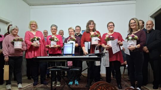 Überreicht wurde den Damen vom ersten Vorsitzenden des Vereins Michael Hahn ein Sekt- und ein Blumenpräsent und - stellvertretend für den Kreischorverband – vom Ortsbürgermeister Hubert Paal eine Urkunde samt Anstecknadel. Reiner Drumm. Rd