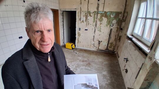 Siesbachs Ortsbürgermeister Klaus Mildenberger mit dem Plan für die Neueinrichtung der Küche im Gemeindesaal. Reiner Drumm