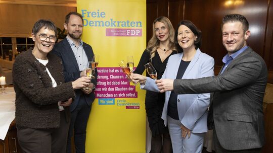 Petra Dick-Walther, Staatssekretärin im Wirtschaftsministerium (von links), FDP-Kreisvorsitzender Sebastian Weber, Landtagswahlkandidatin Kathrin Hoffmann, Wirtschaftsministerin Daniela Schmitt und Steven Wink, der Vorsitzende der FDP-Landtagsfraktion, stoßen beim traditionellen Spießbratenessen im Parkhotel auf ein erfolgreiches Jahr für die Freien Demokraten an. Hosser
