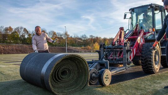 Die Fachfirma hat am Dienstag und Mittwoch die Bahnen des alten Kunstrasens entfernt. Benjamin Werle