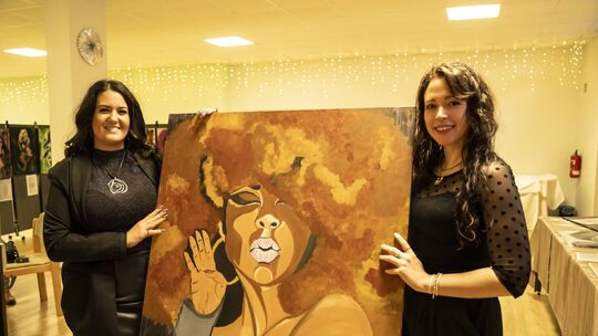 Künstlerin Samira Luscher (links) mit einem ihrer Bilder und ihre Freundin Cindy Tanaewski, Mitgründerin des ganzheitlichen Studios Soma’Raya in Tiefenstein. Hosser. HOSSER