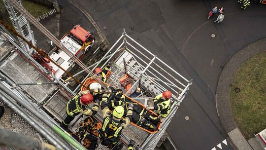 Am vergangenen Samstag hat die Feuerwehr Idar-Oberstein eine Übung zur Rettung aus luftiger Höhe an der katholischen Kirche im Stadtteil Weierbach durchgeführt. An dem derzeit vollständig eingerüsteten Kirchengebäude finden umfangreiche Sanierungsarbeiten statt.