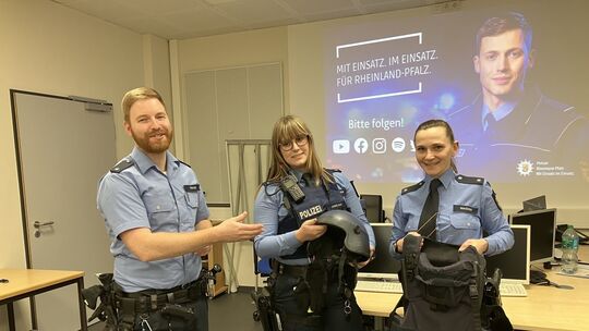 V.l.n.r.: Daniel Kraus, Anna-Lea Cavelius und Theresa Wagner stellen den interessierten Jugendlichen die Polizeiausrüstung vor. Niels Heudtlaß