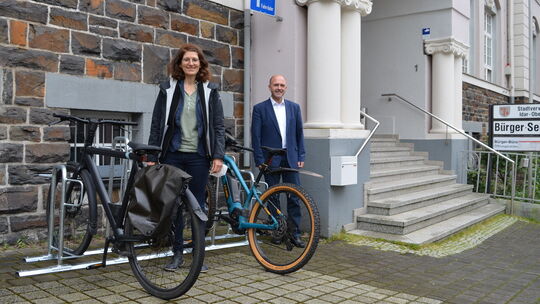 Bürgermeister Friedrich Marx und die städtische Klimaschutzmanagerin Julia Besand vor der neuen Fahrradabstellanlage am Idar-Obersteiner Stadthaus. Weitere Anlagen werden demnächst in den Innenstadtbereichen installiert, kündigt die Verwaltung an. Foto: Stadtverwaltung