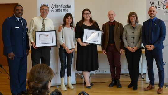 Bei der Preisverleihung in Kaiserslautern gratulierte (von links) Brigadegeneral Otis Jones den Vertretern der Schulen aus Baumholder und Birkenfeld, Todd Coyour, Stefanie Leathers, Katharina Richmond und Florian Höh. Den Glückwünschen schlossen sich Innenstaatssekretärin Nicole Steingaß und John Constance, der Projektverantwortliche für das „WiR!“-Programm, an. Foto: Atlantische Akademie RLP