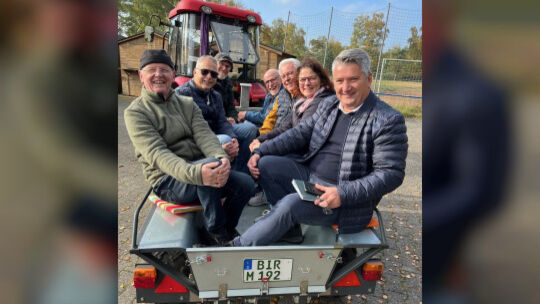 Mit diesem Gefährt machte die Tour durch Mackenrodt ganz offenkundig besonderen Spaß: Landrat Miroslaw Kowalski, die Beigeordnete Susanne Ruhk, Ratsmitglied Willi Wahl, Ortsbürgermeister Reiner Mildenberger, die Ratsmitglieder Thomas Bartholome und Sacha Müller sowie der Beigeordnete Johannes Look (von rechts) haben beim Halt am Sportplatz jedenfalls erkennbar gute Laune. Foto: Axel Munsteiner/Kreisverwaltung Birkenfeld