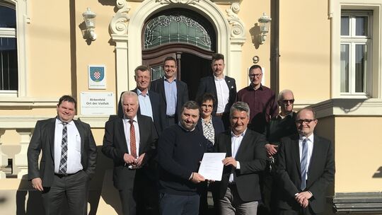 Bürgermeister Miroslaw Kowalski (vorn, 2. von rechts) und der neue Geschäftsführer Maximilian Essig halten den Gründungsvertrag für die neue Entwicklungsgesellschaft in Händen. Die Vertreter von Stadt, Kreissparkasse, Volksbank und der Firmen WVE und Firu flankieren die beiden vor dem Stadthaus. Foto: Axel Munsteiner Axel Munsteiner