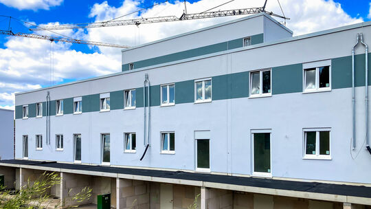 Die in der Wetzel Housing entstehenden Reihenhäuser sollen für drei bis vier Familien ausgelegt werden. Das Bild zeigt einen Rohbau aus dem ersten Bauabschnitt. Bauleitung OBG