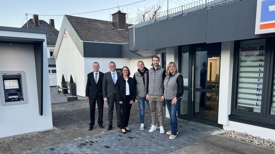 Auch wenn die Sanierung etwas länger dauerte als erhofft – jetzt sind alle Beteiligten sehr zufrieden mit der wieder hergestellten Raiffeisenbank-Filiale in Veitsrodt: Jörg Wagner (von links) und Markus Hofmann von der Raiffeisenbank Fischbach mit ihrer Filialbetreuerin Sandra Dollitz sowie dem Hausbesitzerehepaar Marcus und Nicole Ballat mit Sohn Jan-Philipp. Links im Bild ist der neue, aus Sicherheitsgründen ausgelagerte Geldautomat. Stefan Conradt