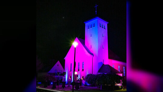Zur Vernissage ist die Kapelle in violettes Licht getaucht worden. Alexander Wolf