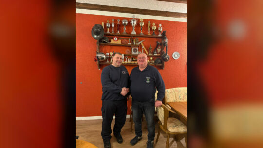 Wehrleiter Marco Braun (links) gratuliert dem bisherigen stellvertretenden Wehrführer Siegfried Schurwanz zur Wahl zum neuen Wehrführer der Stützpunktwehr Baumholder. Braun/Feuerwehr Baumholder