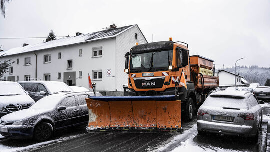 Enge Kiste: Der Streu-Lkw passt auf der Hohl kaum durch die beidseitig parkenden Autos hindurch. Hosser