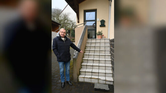 Frauenbergs Ortsbürgermeister Karl-Heinz Thom zeigt die abgeplatzten Fliesen an der Treppe am Dorfgemeinschaftshaus, die nun komplett saniert werden muss. Gerhard Müller
