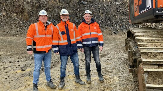 Hier hinter Massimo Döbell, Teamleiter Genehmigungen, SHW-Oberbetriebsleiter Jörg Kalmes und dem Betriebsleiter des Steinbruchs Ellenberg Hans-Lothar Kläser soll der Tunnel vom Steinbruch Ellenberg zum neuen Abbaufeld Gollenberg unter der K7 beginnen. Niels Heudtlaß