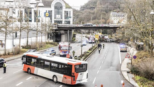 Schwerer Unfall auf der Naheüberbauung in Idar-Oberstein: Linienbus und Streifenwagen zusammengestoßen