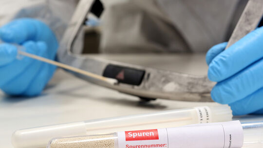 Ein Beamter des kriminaltechnischen Dienstes demonstriert die Suche nach DNA-Spuren.. Christian Charisius/dpa/Symbolfoto. picture alliance / dpa