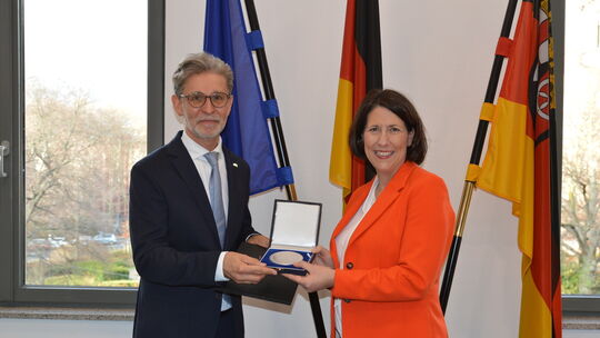 Wirtschaftsministerin Daniela Schmitt hat Unternehmer Thilo Juchem aus Niederwörresbach (Landkreis Birkenfeld), Geschäftsführer der Juchem-Gruppe, mit der Wirtschaftsmedaille der Wirtschaftsministerin ausgezeichnet. Mit der Ehrung würdigt sie sein herausragendes Engagement für die Bau- und Rohstoffwirtschaft, seine Innovationskraft sowie sein besonderes gesellschaftliches und soziales Wirken.