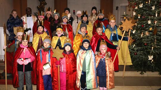 Sternsinger sind am Wochenende in Lauschied und Abtweiler unterwegs. Kooperator Zoé Dovonou ermutigt die 16 Kinder bei der Aussendung in der Pfarrkirche St. Georg.