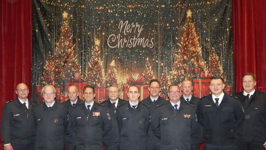 Wehrleiter Michael Seibel (von links) mit den Geehrten Dirk Qazi, Peter Regelin, Jens Becker, Peter Steinbrecher, Alexander Petry, Roland Renner, Steffen Frech und Torsten Klein. Auch der Stellvertretende Wehrleiter Kai Mathias (von rechts) und der neue BKI Alexander Roßkopf gratulierten. Jens Fink