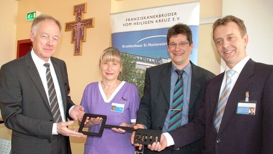 Architekt Hubertus Sander (links) übergab den Stationsschlüssel für die Akutpsychosomatik an Abteilungsleiterin Margit Sax, Chefarzt Dr. Holger Rennollet (rechts) und Verwaltungsdirektor Helmut Ziegler. Die Bettenkapazität der Abteilung soll möglichst bald aufgestockt werden. Armin Seibert