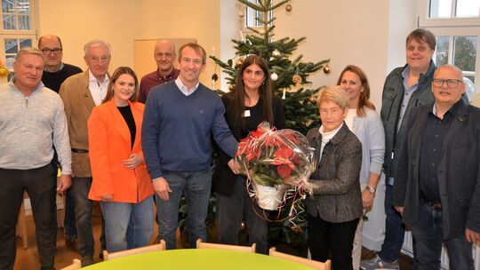 Vorweihnachtliche Bescherung durch Ilse Lang (4. von rechts), Begründerin der Alisastiftung in Worms und Kirn. Die 87jährige Tochter des früheren Kirner Lederfabrikanten Jakob Müller finanzierte die 1,5 Millionen Euro teure Kernsanierung des Obergeschosses und feierte das mit ihrem Team, Vertretern der Bürklestiftung, Bürgermeistern und langjährigen Weggefährten. Seibert Armin