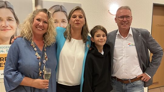 Landrätin Bettina Dickes konnte eine Wahlsiegerin in die Arme nehmen, der ganz sicher ein Zentner von den Schultern genommen worden war: Andrea Silvestri mit ihrem Sohn Flavio und dem Rüdesheimer VG-Bürgermeister Markus Lüttger. Robert Neuber