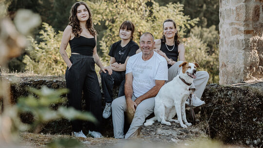 Familie Nees, die in ihren Ferienwohnungen gerne Gäste in Bärenbach begrüßt (von links): Lisa Marie, Maxima, Jörg und Heike sowie Hundedame Mila. Nees