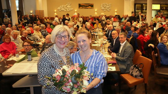 Im aus allen Nähten platzenden Kurhaussaal dankte Ortsbeiratsmitglied Viola Schneider (rechts) mit Blumen ihrer Ortsvorstehein Birgit Ensminger-Busse für ihre geleistete Arbeit. Josef Nürnberg