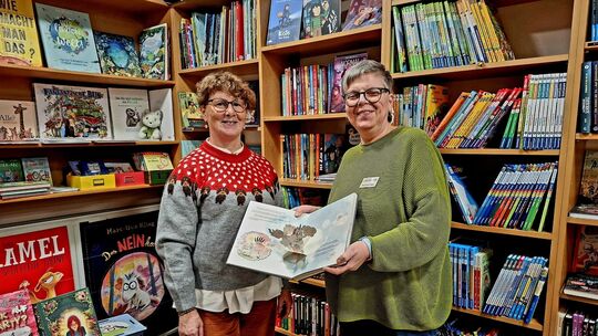 Die beiden Lesepatinnen Claudia Römer (links) und Anja Schneider an einem ihrer liebsten Orte: Bücher, Bücher und mittendrin das Pop-up-Buch "Das NEINhorn"! Claudia Römer
