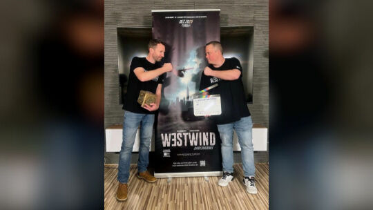 Regisseur Achim Goldschmidt (links), Chef des Filmteams, und sein Assistent Sven Brandenberg vor dem Filmplakat von „Westwind – Dark Shadows“. Sebastian Schmitt