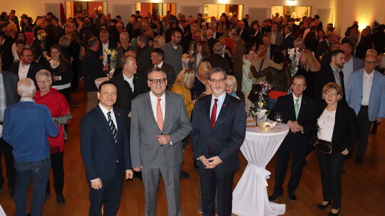 Auch interntionale Gäste begrüßte Oberbürgermeister Thomas Feser (Mitte) beim Neujahrsempfang, darunter den türkischen Generalkonsul Mehmet Akif Inam (rechts daneben) und den chinesischen Vize-Generalkonsul Pengfei Wu (links). Rainer Gräff