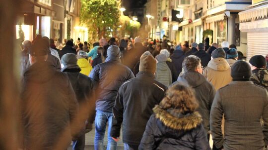 Auch nachdem die Stadt die Auflagen für unangemeldete Proteste zuletzt verschäft hat, waren am Montagabend wieder bis zu 1000 Menschen in der Bad Kreuznacher Innenstadt (hier in der Kreuzstraße) unterwegs, um gegen die aktuellen Corona-Maßnahmen zu demonstrieren. Sie wurden um den Kornmarkt herumgeleitet, wo die zweite von Stadtrat Stefan Butz (PBK) initiierte Mahnwache zum Gedenken an die Corona-Toten stattfand. Foto: Markus Kilian Markus Kilian