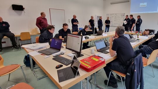 Lagebesprechung des Führungsstabs der Verbandsgemeinde Nahe-Glan bei der Übung. Foto: Feuerwehr VG Nahe-Glan/Seith feuerwehr vg Nahe-Glan