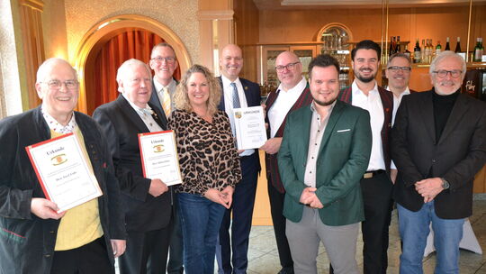 Vorsitzender Jürgen Merz (6. von links), freute sich gemeinsam mit Tim Schwickert (3.von rechts) und Ralf Jung (2.von rechts), den neuen Ehrenmitgliedern Josef Fuhr (links) und Albert Görtz (2.von links) über die Glückwünsche von Olaf Budde (3. von links), Bettina Dickes, Michael Cyfka (5. von links), Achim Linke (4. von rechts) und Michael Zimmermann (rechts). Dieter Ackermann