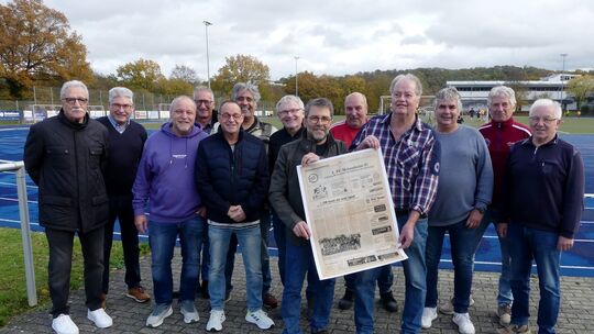 40 Jahre später: Die meisten Kicker der ehemaligen Meistermannschaft 1985 leben nach wie vor in Meisenheim und Umgebung. Links: Meistertrainer Lothar Zoller und der aktuelle FCM-Vorsitzende Rolf Staab (2. von links). Thomas Ammann (links) und Dieter Mohr präsentieren die Sonderseite aus dem Allgemeinen Anzeiger. Roswitha Kexel
