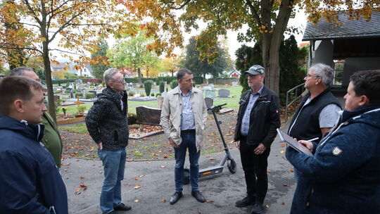 Auf dem Friedhof traf sich der Bauausschuss der Stadt zu einem Ortstermin. Grund: Bürger beschwerten sich, dass die Friedhofshalle als Aushängeschild der Stadt renovierungsbedürftig sei, informierte der Erste Beigeordnete und Vorsitzende Markus Milferstedt.