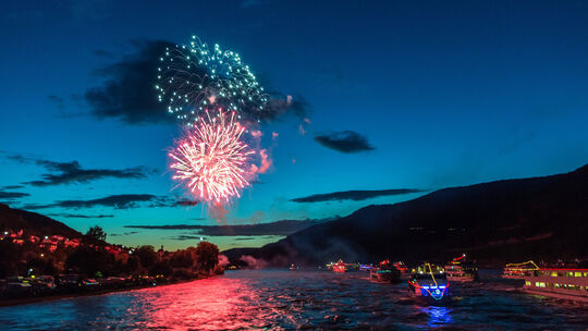 Ein schier endloser Schiffskonvoi, eine atemberaubende Abfolge von Feuerwerken, Menschenmengen an der Ufern und die einmalige Landschaft des Unesco-Weltkulturerbes Oberes Mittelrheintal gehören zum Großereignis „Rhein in Flammen“. Foto: Stadt Bingen/Achim May Achim May Stadt