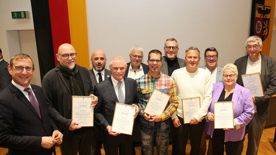 Landrat Thomas Barth (links) verlieh den Ehrenbrief für besonderes kulturelles Engagement an (von links) Markus Weickardt (Gensingen), Adam J. Schmitt (Weiler), Sven Eckes (Waldalgesheim), Jörg Mantschenko (Waldalgesheim), Ewald Lenhart (Weilerer Carneval Verein), Petra Pappert (Weiler), Peter Vollmer (Bingen). Mit auf dem Bild: Bingens OB Thomas Feser, Benedikt Seemann (Bürgermeister der VG Rhein-Nahe) und Manfred Scherer (VG Sprendlingen-Gensingen) Edgar Daudistel