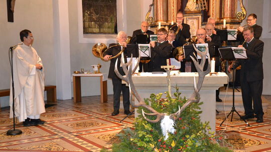 Ein weiterer Höhepunkt im Rahmen des 900-jährigen Jubiläums der Ortsgemeinde Rümmelsheim war die feierliche Hubertusmesse in der mit Tannengrün geschmückten Pfarrkirche St. Laurentius, gestaltet von Kooperator Phu Tho Mai und der Jagdhorn-Bläsergruppe Gollenfels Stromberg, um Hornmeister Klaus Ellerbrock.