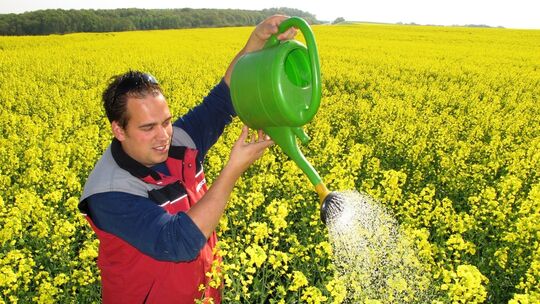 Mit der Gießkanne auf den Acker: Thomas Funck auf einem vier Hektar großen Rapsfeld (Sorte „Express“) bei Waldböckelheim. Die (natürlich) gestellte Szene macht deutlich: Die Bauern des Nahelandes hoffen auf jeden Tropfen. Doch noch ist der dringend gebrauchte Regen nicht in Sicht.