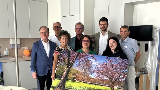 Neu gestaltete Kreißsäle mit Motiven aus der Region gibt es jetzt in der Kreuznacher Diakonie. Das feierten (v. l.) Karlheinz J. Ossig (Stifter), Michael Kumbartski (Chefarzt Geburtshilfe), Cordula Niemann-Valerius (Vize-Vorsitzende Ossig-Stiftung), Stefan Pallesch (Küche Creativ), Sandra Maus (Malermeisterin), Patrick Funke (Immotactics), Emma Sulzbacher (Schulz-Farben) und Christoph von Buch (Ärztlicher Direktor, Chefarzt Kinder- und Jugendmedizin). Cordula Kabasch