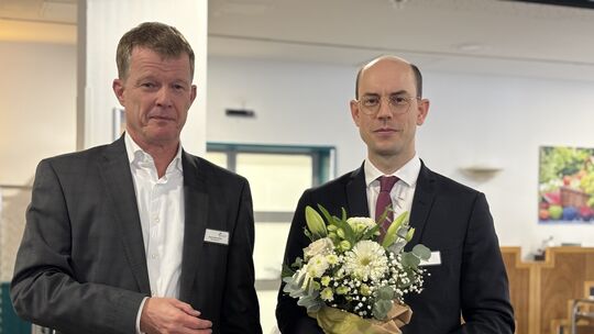 Geschäftfsührer Jürgen Sprekelmeyer begrüßt den Nachfolger des ärztlichen Direktors Professor Andreas Schwarting, den Privatdozenten Dr. Wolfgang Merkt. RZ Rheumazentrum GmbH