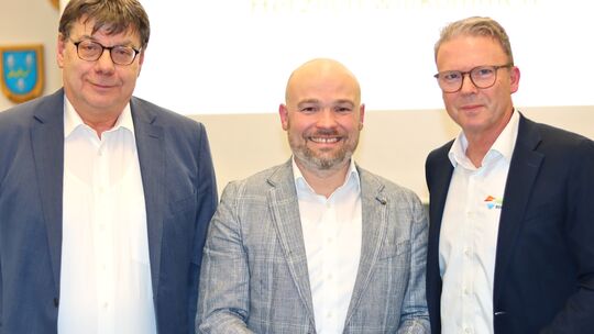 Haiko Grün (Mitte) ist am Mittwochabend zum neuen Ersten Beigeordneten der VG Rüdesheim gewählt worden. Er folgt auf Heinz-Martin Schwerbel (links) in der VG, die Bürgermeister Markus Lüttger leitet. Markus Kilian