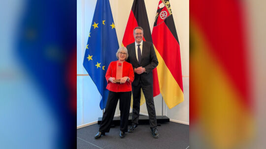 Inge Lütz und Ministerpräsident Alexander Schweitzer bei der Preisverleihung Inge Lütz
