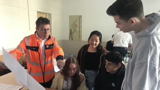 Michael Herbster (von links) informierte Emma Grunwald, Elena Nguyen, Alexander Filippidis und Elias Kirchner über den Beruf des Brückenbauers. Foto: Josef Nürnberg bj
